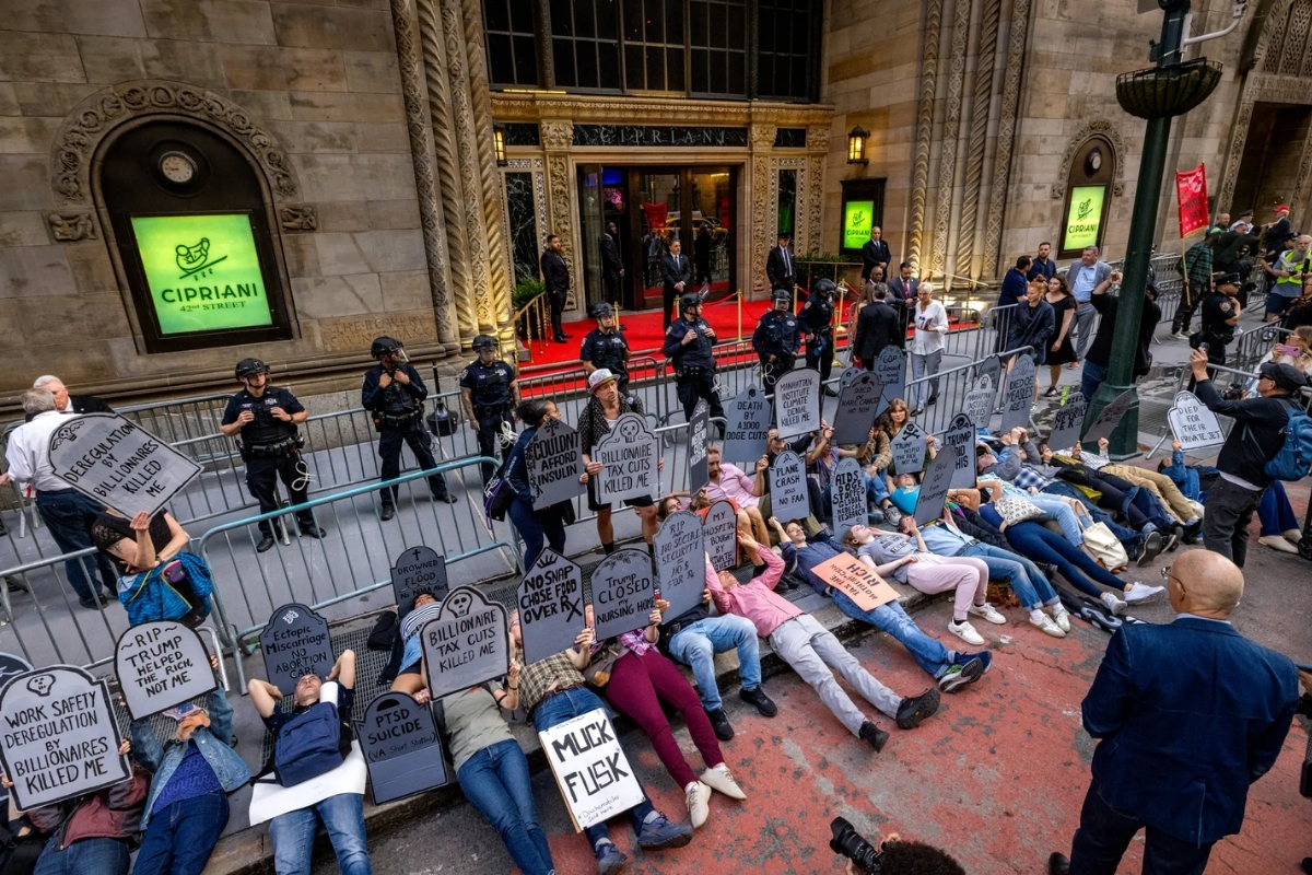 Sol görüşlü protestocular, etkinliğin savurganlığını ve katılımcılarını kınamak için bir “ölüme gömülme” eylemi düzenlediler.
