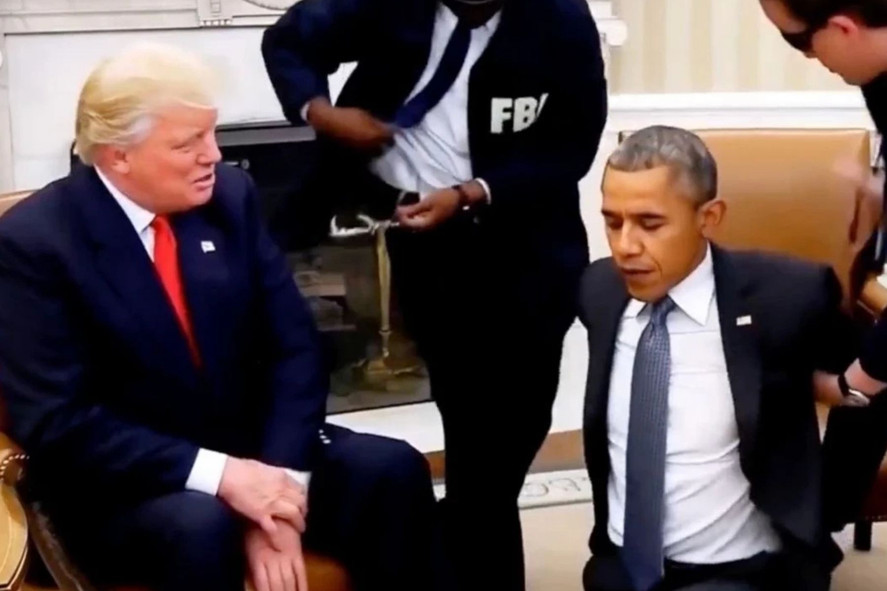 Oval Ofis’te Trump ve Obama yan yana otururken, FBI ajanlarının gelip Obama’yı yaka paça gözaltına aldığı sahneler izleyenleri şaşkına çevirdi. Videodaki parçada Trump’ın mitinglerinde sıkça kullandığı “YMCA” şarkısı da dikkat çekti.